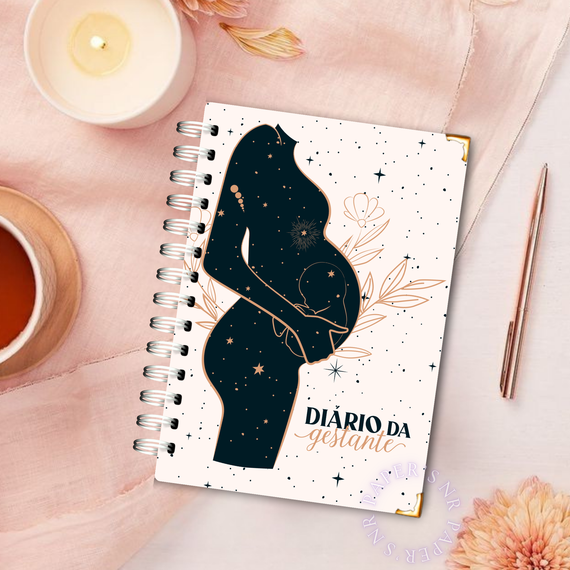 ✨ São 230 páginas em papel 90g, capa 15,5×21,5cm, com cantoneiras e elástico lateral.