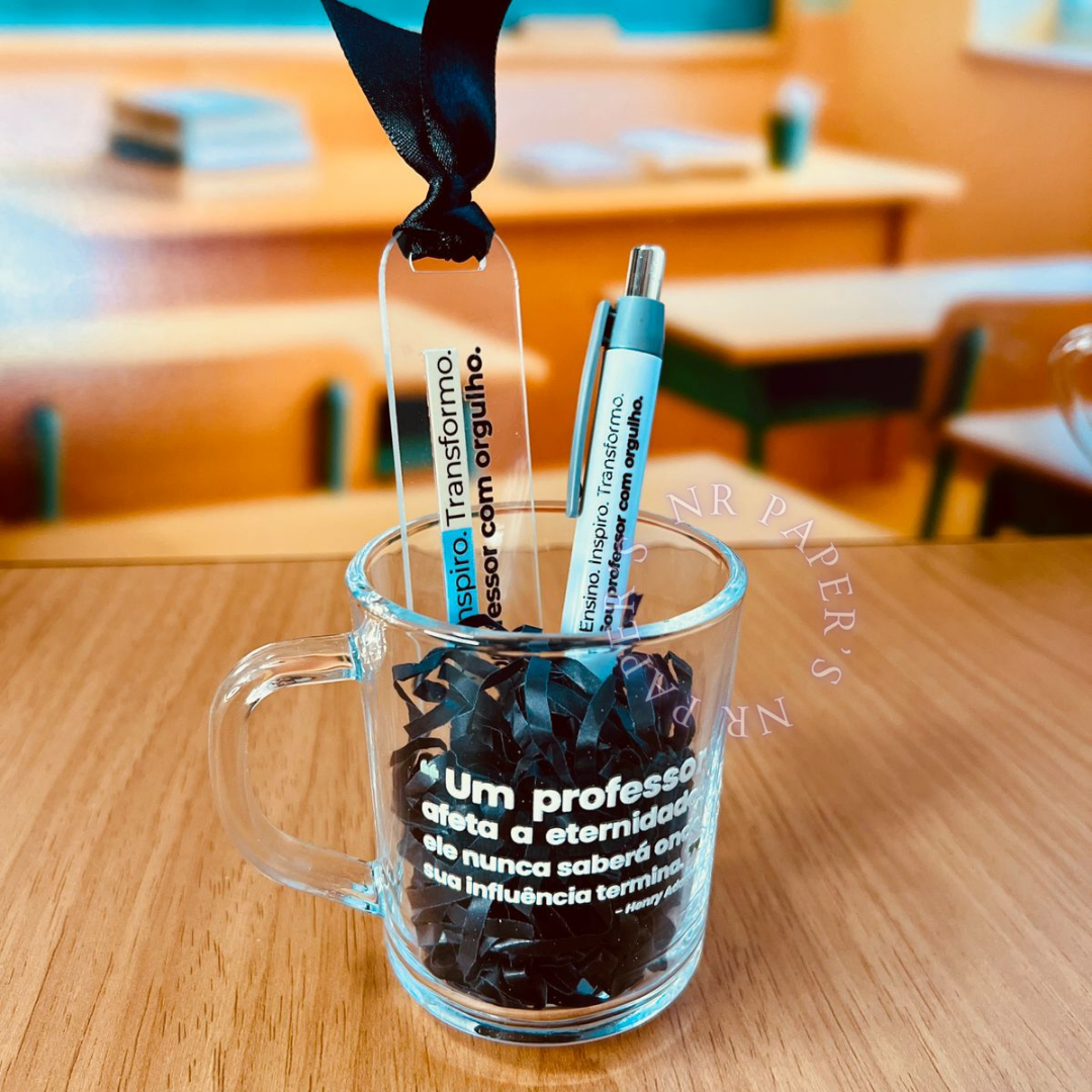 Caneca + Marca-Páginas em Acrílico + Caneta